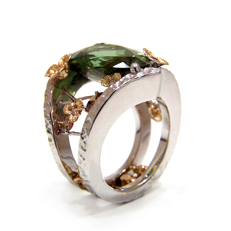 La bague Génie du Jardin, en or blanc et or jaune 750/1000 est sertie d'une tourmaline verte taillée en poire ainsi que de diamants de couleurs pour habiller ses délicates fleurs.