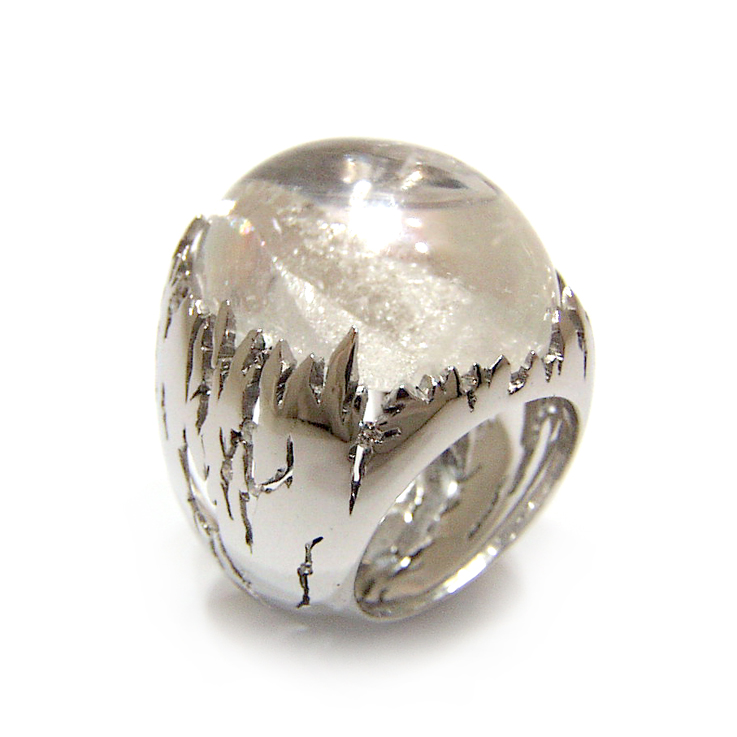 La bague "Native" ou "L'origine de la vie" fait partie de la collection Glace et Neige, en or gris palladié 750/1000. Elle tient son nom de sa pierre centrale, le quartz, d'une pureté presque parfaite jaillissant de la bague, tel un volcan au milieu de l’océan...
