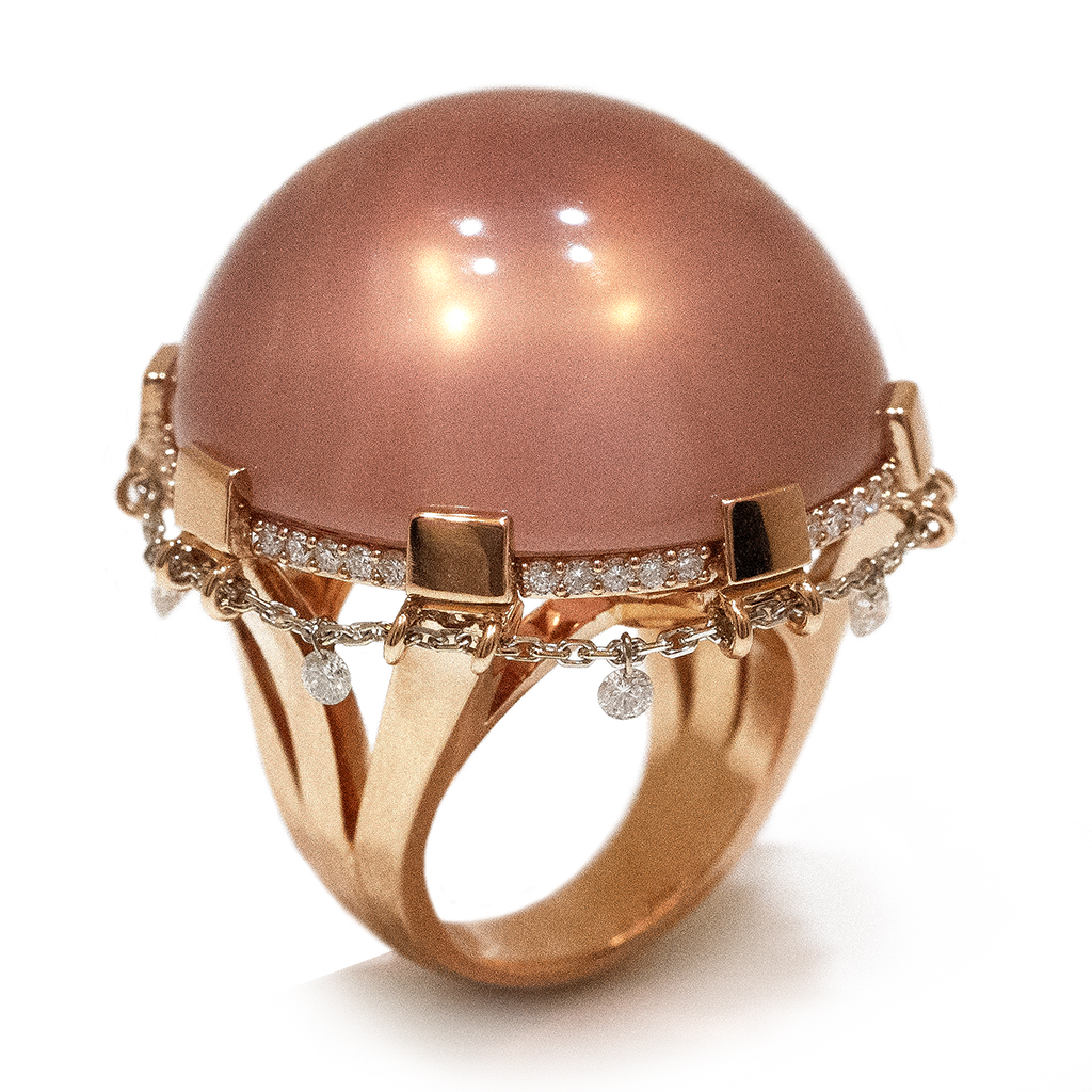 Cette bague, en or rouge 750/1000 est un monument de la joaillerie : la pierre en son centre est unique et les détails de la monture la mettent merveilleusement en valeur.