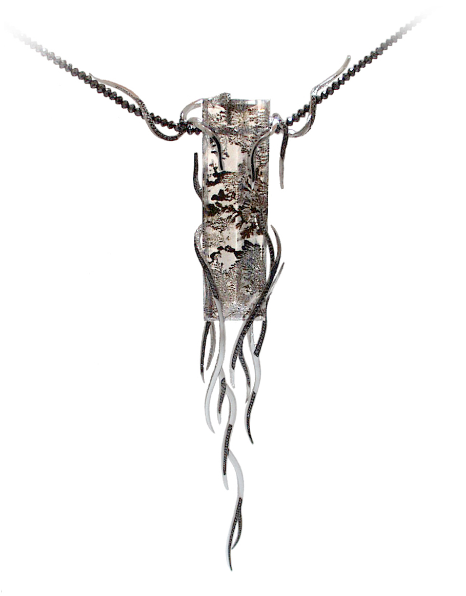 Le collier Amazone, en or gris palladié 750/1000, aussi appelé "orchidée noire", est une pièce emblématique avec son quartz unique allié aux diamants noirs qui viennent l'habiller.