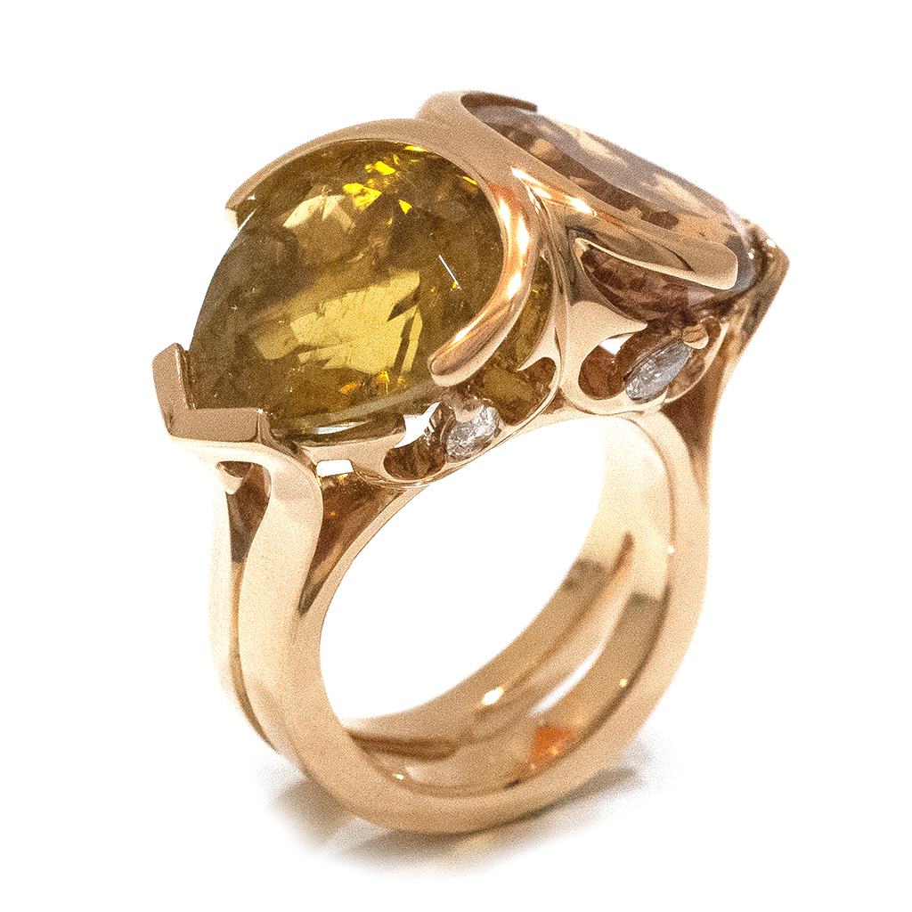 Bague de la collection Moyen-Age et l’Âme Secrète, aussi appelée "GOTHIQUE", or rose 750/1000. Cette bague est unique et se compose de deux tourmalines aux couleurs ancestrales. La monture nous rappelle l'architecture gothique, les diamants en poires sont suspendus tels des gargouilles.