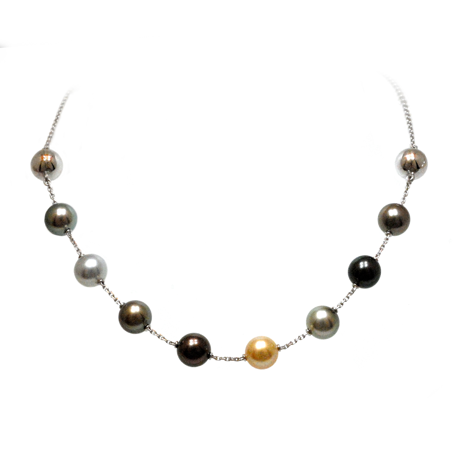 A la fois collier et bracelet cette pièce Apparition dans l'Écume, en or blanc 750/1000, modernise le collier de perles classique, de par sa multitude de couleurs et son montage sur or qui peut se transformer en bracelet.