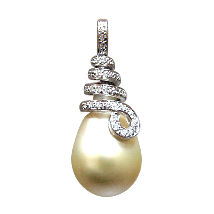 Pendentif Apparition dans l'Écume, en or gris palladié 750/1000. Ce pendentif se compose d'une perle doré provenant d'Australie et d'une rivière de diamants qui vient l'enlacer.