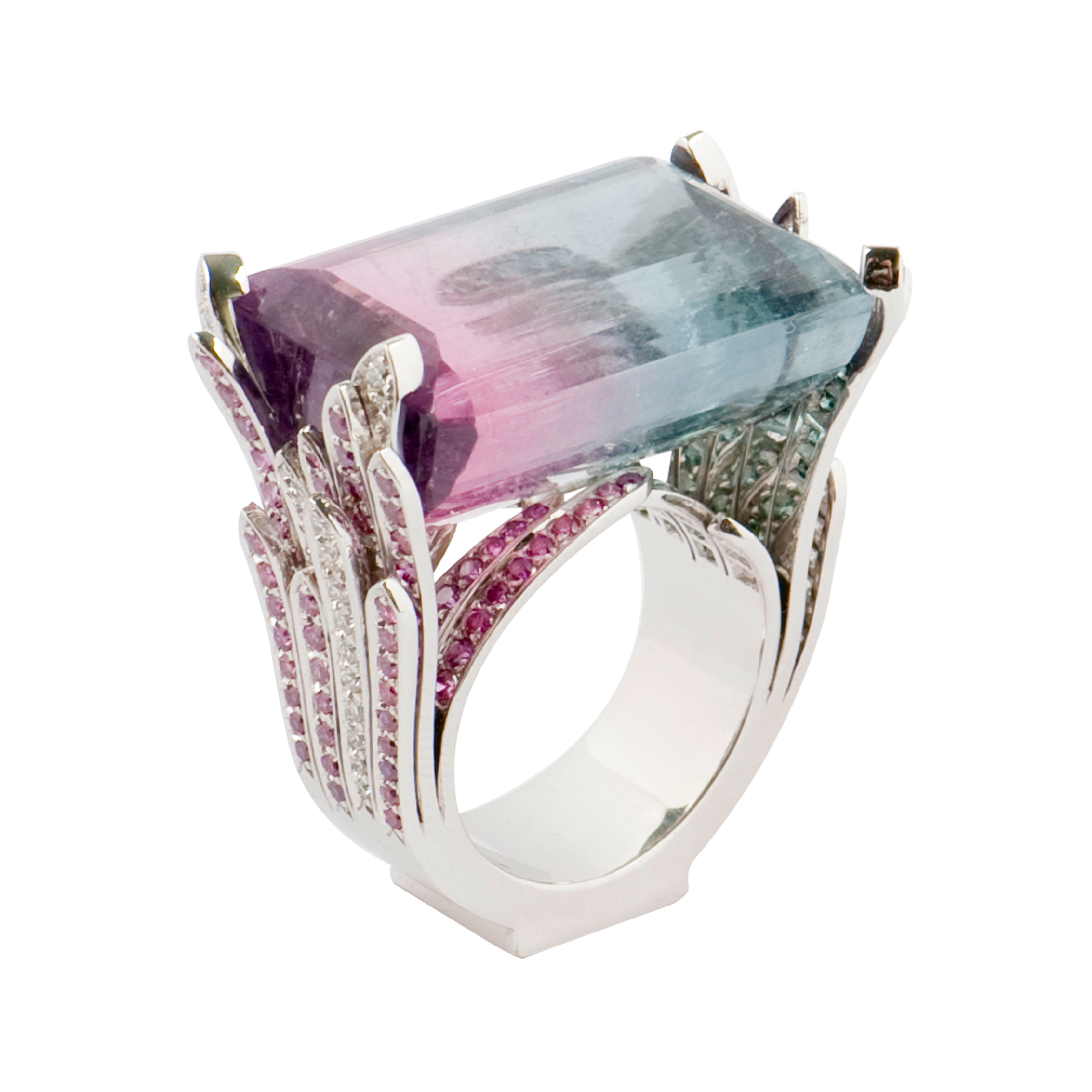 "La bague au deux Ailes", inscrite dans la collection Ciel Étoilé, est en or gris palladié 750/1000. La tourmaline centrale s'élève entre les deux ailes serties de diamants de même couleur que celle-ci. C'est une réelle pièce unique qui invite à la légèreté et à la douceur.