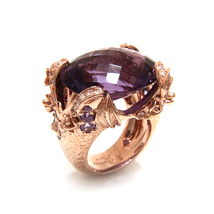 La bague Génie du Jardin n°03, est en or rouge 750/1000, en son centre une améthyste ovale, habillée d'un décor floral, a un corps texturé qui reprend cet esprit de "jardin".