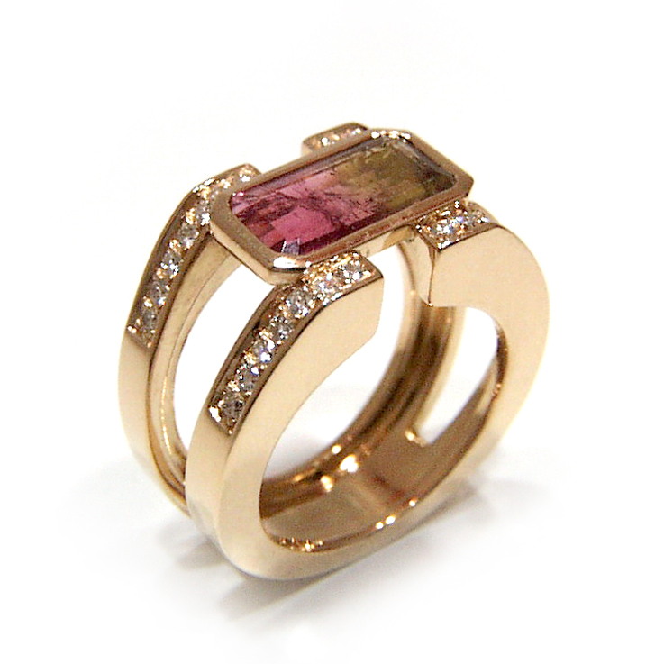 La bague Art Décoratif n° 02, en or jaune 750/1000, est simplement tenue entre des griffes aux allures géométriques, cette pièce se caractérise par son côté aérien et par sa simplicité.
