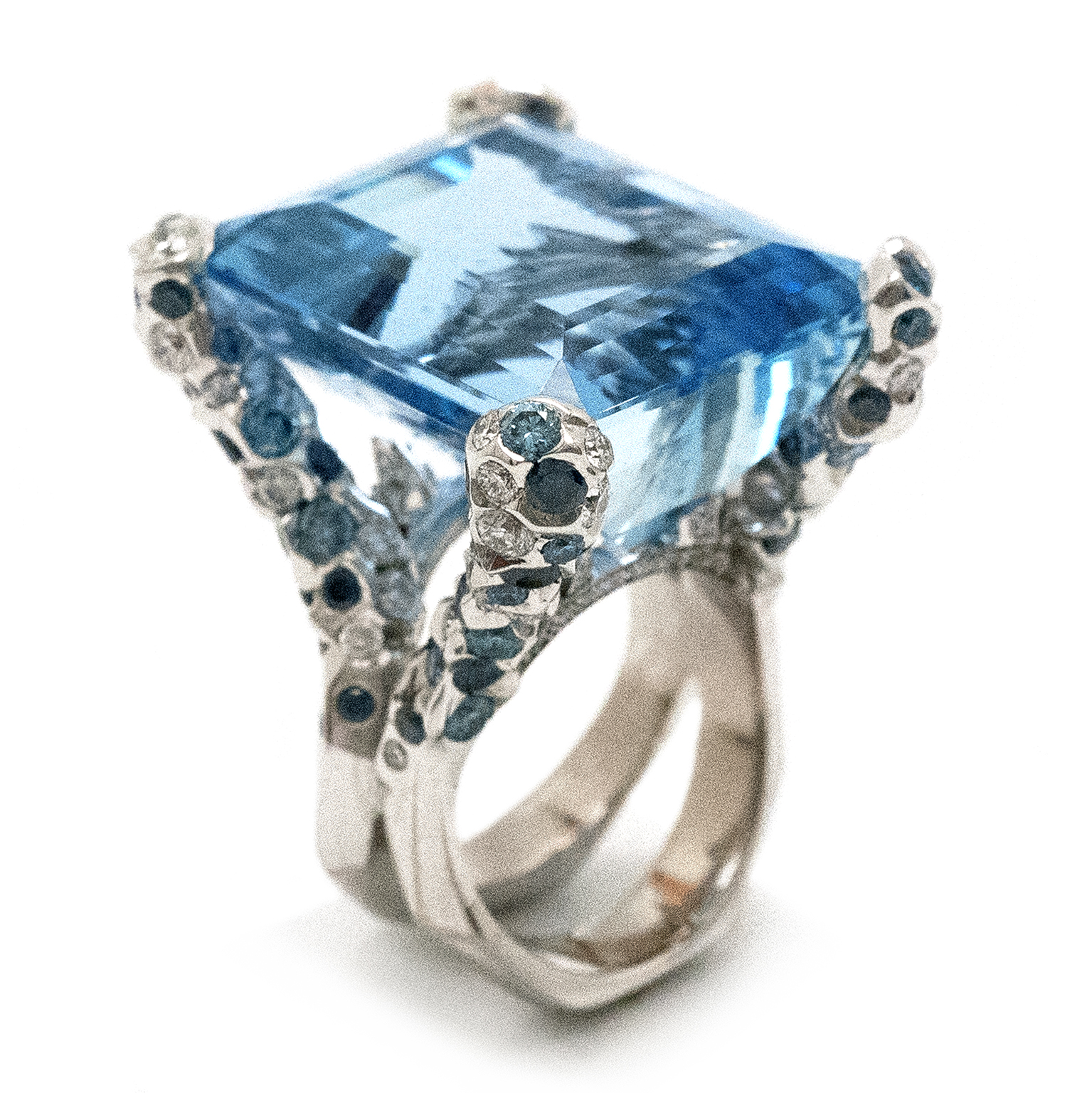 La bague "palais des glaces" entre dans la collection Glace et Neige, elle est en or gris palladié 750/1000. L'aigue marine centrale règne en maître sur cette splendide bague parsemée de diamants bleus et blancs.