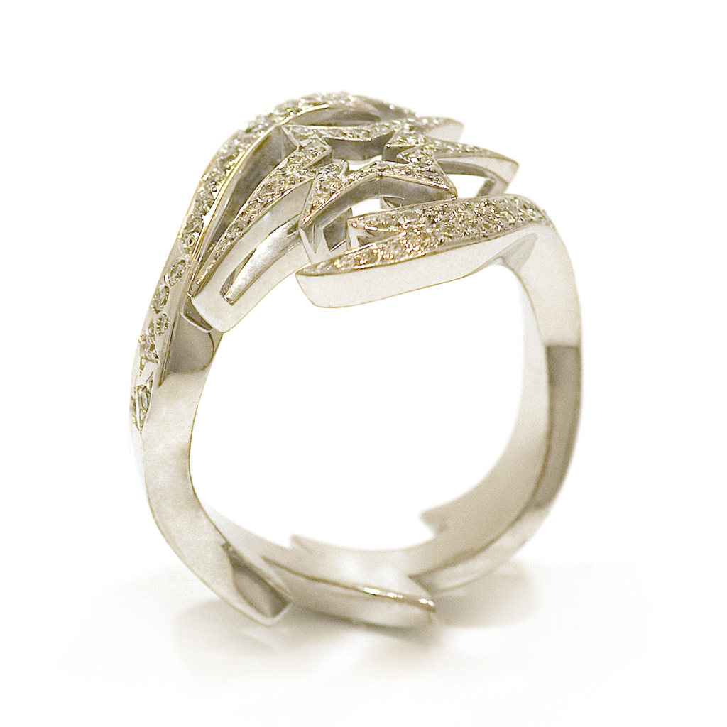 Bague Ciel Étoilé n° 1 en or gris palladié 750/1000. Elle illuminera votre main telle une étoile filante dans un ciel d'été.