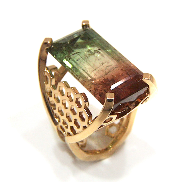 La bague Génie du Jardin n°01, aussi appelée "Ruche", est en or jaune 750/1000. L'imposante tourmaline en son centre vient régner telle la reine des abeilles sur cette structure alvéolaire...