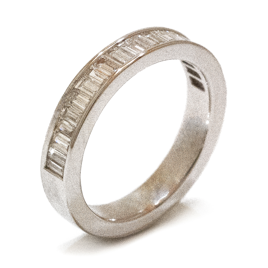 Demi-alliance or gris palladié 750/1000, sertie de 21 diamants tailles baguettes. Disponible en or jaune et en or rouge sur demande.